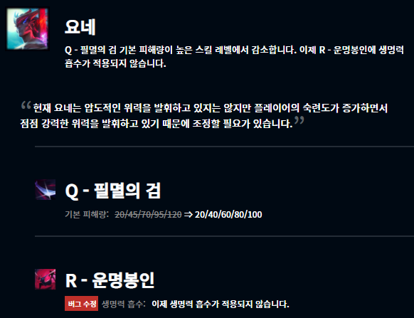 | 요네 | Q스킬 기본 피해량 20/45/70/95/120 -> 20/40/60/80/100 R스킬 생명력 흡수가 적용되지 않습니다. |