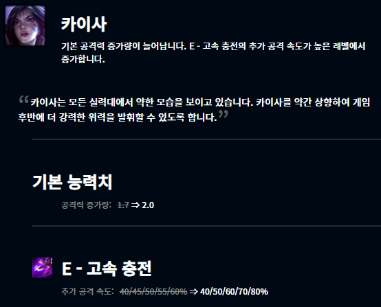 | 카이사 | 공격력 증가량 1.7 -> 2.0 E스킬 추가 공격속도 40/45/50/55/60% -> 40/50/60/70/80% |