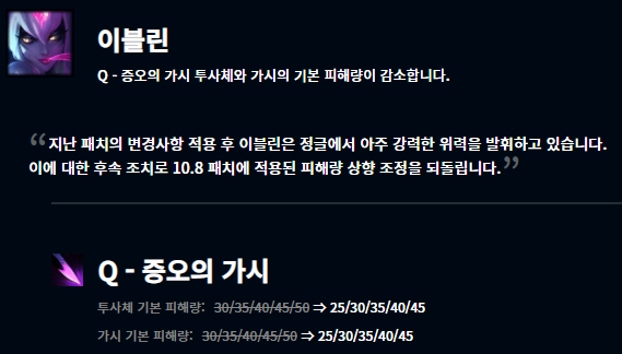 | 이블린 | Q스킬 투사체 기본 피해량 30/35/40/45/50 -> 25/30/35/40/45 Q스킬 가시 기본 피해량 30/35/40/45/50 -> 25/30/35/40/45 |