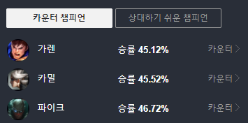 가렌의 경우 초반에 킬각을 잡지 못한다면 점점 시간이 흐를수록 솔킬을 따내기가 어려워지며 오히려 가렌이 Q-E-점화-R 콤보로 탈론을 순삭시킬 수 있기 때문에 힘듭니다. 또한 가렌은 일정 시간동안 피해를 입지 않으면 체력이 차는 패시브 스킬을 보유하고 있어서 라인 유지력도 좋은 편이니 초반에 승기를 가져오지 못한다면 가렌을 죽이는 것은 포기하고 라인만 빠르게 밀고 다른 라인에서 영향력을 행사하는 로밍 플레이를 추천드립니다. 카밀같은 경우도 브루저 챔피언인만큼 데미지도 강력한데다가 기본 체력과 방어력이 탈론보다 높게 설정되어 있어서 후반으로 가면 갈수록 탈론이 카밀을 암살하기란 힘들고, 역으로 카밀이 궁을 통해 탈론을 암살하는게 가능합니다. 그 외에도 근접 ad 챔피언이기 때문에 레넥톤이나 이렐리아같은 브루저 챔피언들이 보통 탈론에게 힘들 수 있습니다.
