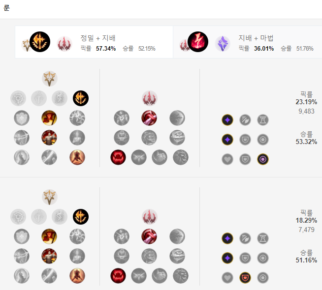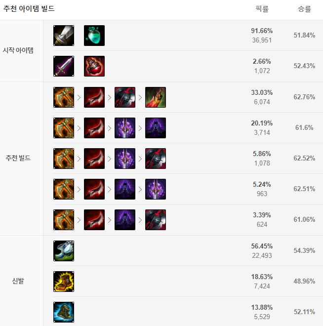 원래는 상성상 불리한 브루저나 탱커를 상대하기 위해 한정적으로 정복자 룬을 들었으나, W스킬이 너프를 먹은 이후로 킬각을 잡기 힘들어져서 감전을 제치고 정복자가 주요 룬으로 떠올랐습니다. 정복자 룬에 승전보, 강인함, 최후의 저항 룬을 들어주는 것을 추천드리고 보조 룬에는 피의 맛과 굶주린 사냥꾼으로 피흡을 늘리는 것을 추천드립니다.