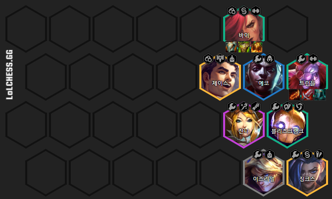 기본 덱 구성은 이즈리얼, 바이, 블리츠크랭크, 트런들, 에코, 잔나, 제이스, 징크스입니다. 트런들이 핵심 딜러겸 서브 탱커이고 바이를 초반에 핵심 탱커로 사용하는 것이죠. 후반에는 제이스에게 탱템을, 징크스에게 공템을 나눠주면 되는 형식입니다.