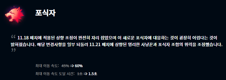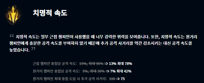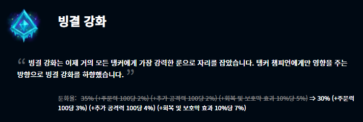 정복자의 경우 11.21 패치에서 너무 크게 너프했기 때문에 어느정도 버프를 해주어 밸런스를 잡은 모습입니다. 치명적 속도의 경우에는 근접 챔피언들이 사용할 때에는 너프, 원거리 챔피언들이 사용할 때에는 버프며 빙결 강화는 일부 탱커 챔피언들이 사용했을 때 너무 좋은 효율을 보여줘서 탱커들이 사용할때만 살짝 너프되었네요. 포식자도 최대 이동 속도 증가 및 도달 시간 증가로 적절한 변화를 주었습니다.