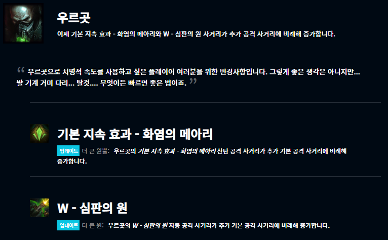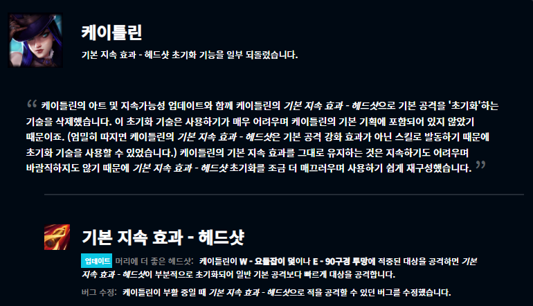 케이틀린, 아이번, 케일, 사미라, 트위치, 우르곳이 버프되었습니다. 구체적인 내용은 살펴보면 아시겠지만 이번 패치로 인해 그렇게 큰 밸런스를 깨지는 않는 것 같네요.