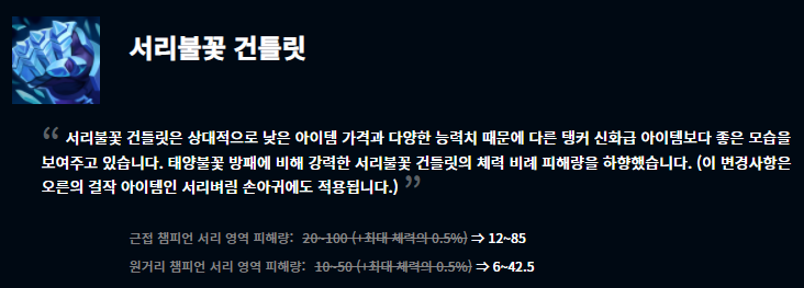 프리시즌이 되어 새로 등장한 아이템들과 변경된 아이템들이 다시 버프 및 너프, 조정당했습니다. 원칙의 원형낫같은 경우는 크게 너프되었고 부서진 여왕의 왕관은 암살자들을 상대할 때 너무 좋은 효율을 보여줬기 때문에 너프를 했네요.