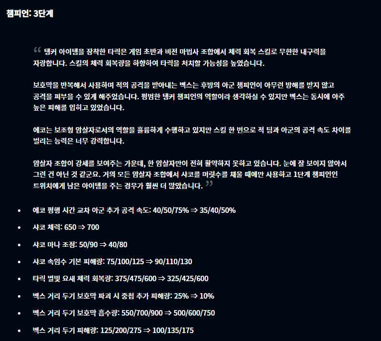 벡스가 진짜 크게 너프되어서 이제 관짝으로 갈 것 같으며 더불어 하이머딩거 역시 스킬 딜링 너프로 사실상 요들 덱은 이제 버티기 힘든 덱이 될 것 같습니다. 샤코는 암살자 시너지를 채우는 역할만으로 사용되었는데 이에 버프를 해주었고 에코는 살짝 너프해줬네요. 리산드라의 경우 스킬이 가끔 제대로 안나가는 버그가 있었는데 이를 수정하면서 더불어 너무 강력하지 않게 너프를 해주었습니다. 사미라는 지난 번 11.23 패치에 이어 한 번 더 너프를 당하네요.