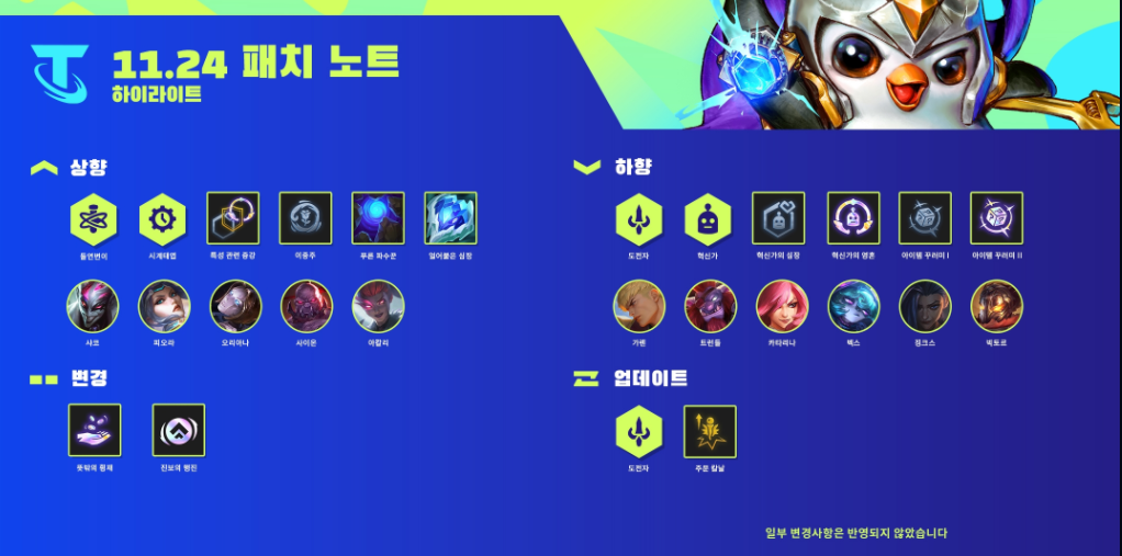 이번 시간에는 롤토체스(전략적 팀 전투) 11.24 패치노트에 대해서 알아보도록 하겠습니다. 개인적으로 이번 패치로 인해 많은 변화가 일어날 것이라고 생각되고 증강체 선택이 더욱 중요해지는 패치가 아닐까 생각이 드네요. 그러면 과연 어떤 많은 변화들이 있는지 한번 11.24 패치노트를 통해 알아보도록 하겠습니다.