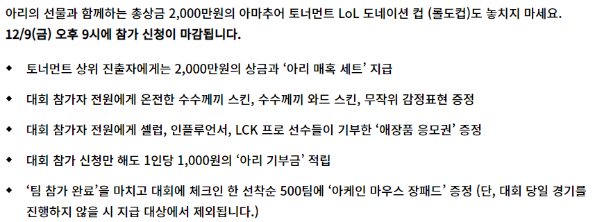 롤 아마추어 토너먼트 대회, 롤 도네이션 컵(롤도컵)이 열립니다. 참가 마감은 12월 9일 오후 9시이며 상위 진출자들에게는 상금을 포함하여 아리 매혹 세트를 얻을 수 있고 대회 참가자 전원에게는 온전한 수수께끼 스킨, 수수께끼 와드 스킨, 무작위 감정표현이 지급됩니다. 더불어 셀럽, 인플루언서, LCK 프로 선수들이 기부한 '애장품 응모권'도 증정되죠. 대회 참가 신청만 해도 1인당 1,000원의 '아리 기부금'이 적립되며 '팀 참가 완료'를 마치고 대회에 체크인 한 선착순 500팀에게는 아케인 마우스 장패드가 지급됩니다.