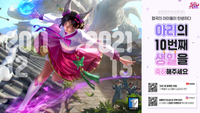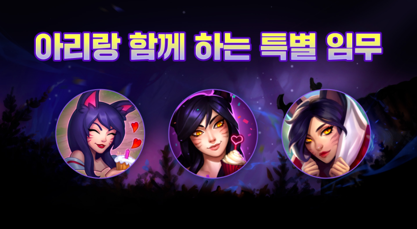 이번 시간에 알아볼 것은 롤 한국 서버 상륙 기념으로 등장한 챔피안 아리가 10번째 생일을 맞아서 진행하는 '아리'랑 이벤트입니다. 간단하게 핵심만 요약해보자면 아리 챔피언, 한복 아리 스킨, 크로마, 아이콘, 감정표현을 받을 수 있는 임무가 등장하는 것입니다. 또한 상점에서 1RP로 아리 스킨: 태극 크로마 12종을 구매할 수 있는 것, 그 외에도 추가적으로 여러 가지가 있습니다. 하나하나 알아보도록 하죠.