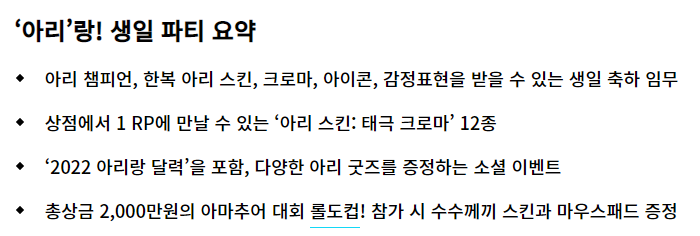 아리 챔피언, 한복 아리 스킨, 크로마, 아이콘, 감정표현을 받을 수 있는 임무 / 상점에서 1RP에 만날 수 있는 '아리 스킨: 태극 크로마' 12종 / '2022 아리랑 달력'을 포함, 다양한 아리 굿즈를 증정하는 소셜 이벤트 / 총상금 2,000만원의 아마추어 대회 롤도컵! 참가 시 수수께끼 스킨과 마우스패드 증정 이렇게 네 가지로 요약할 수 있습니다.