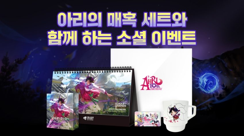 리그오브레전드 공식 페이스북과 인스타그램에 방문하여 아리에게 생일 축하 메시지를 남기면 됩니다. 추첨 100명에게 '2022 아리랑 달력'을, 10명에게는 아리 플립북, 머그컵, 드립백, 달력이 포함된 '아리 매혹 세트'를 준다고 합니다. 또한 생일 축하 메시지들은 12월 10일 금요일부터 한달 간 강남 고속버스터미널역 대형 화면을 통해 게시된다고 하네요.