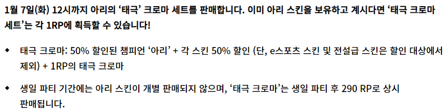 아리 태극 크로마 세트가 1월 7일 화요일 오전 12시까지 판매됩니다. 총 12종의 아리 스킨 크로마가 1RP에 판매된다고 하니 아리 스킨이 있는 사람은 크로마를 구입해주면 되겠습니다. 스킨이 없는 경우 크로마는 사용하지 못하지만 기본적으로 한복 아리 스킨은 이번 이벤트를 통해 얻을 수 있으니 한복 아리 태극 크로마는 한복 아리 스킨 획득 후 상점에서 구매해주시면 사용이 가능하겠죠? 기존에는 스킨이 없어도 크로마만 따로 구매가 가능했기에 이번에도 만약 그렇다면 일단 12종 크로마를 모두 구매해놓고 나중에 아리 스킨이 나오면 그때 사용해주시는것도 좋은 방법입니다.
