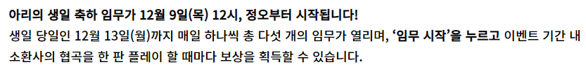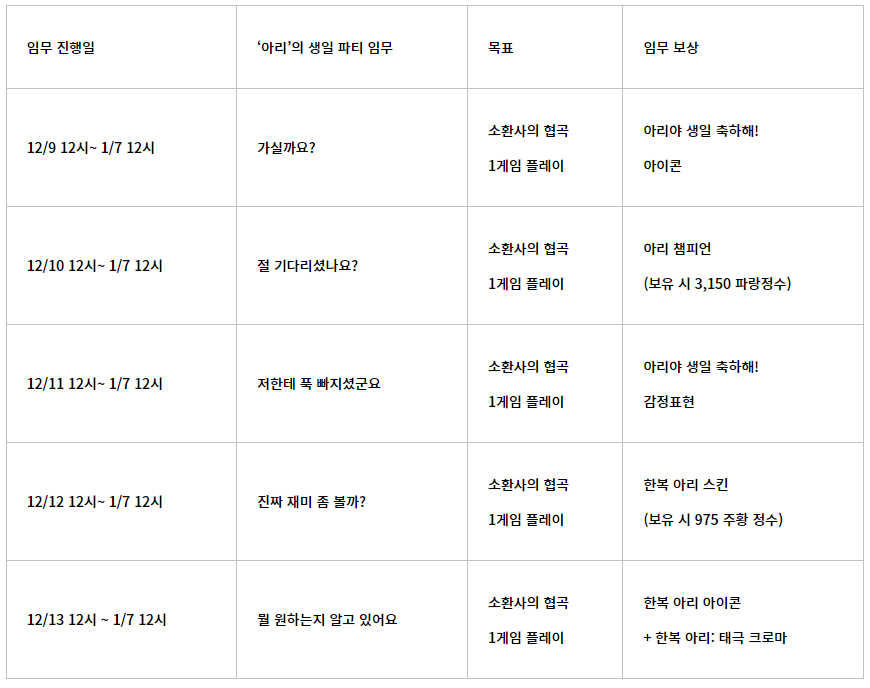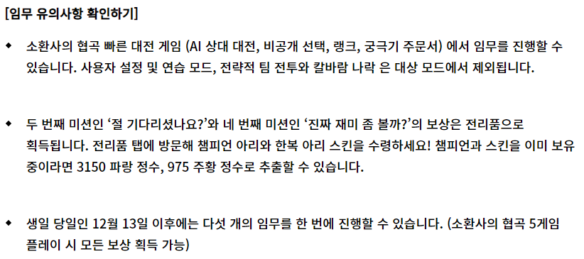 보면 알 수 있듯이 12월 9일부터 12월 13일까지 매일 12시가 되면 임무가 생깁니다. 이 임무들을 클리어하면 첫날부터 순서대로 아리 아이콘, 아리 챔피언, 아리 감정표현, 한복 아리 스킨, 한복 아리 아이콘(+한복 아리: 태극 크로마)를 얻을 수 있습니다. 임무의 내용은 소환사의 협곡 1회 플레이이며 AI전, 비공개 선택, 랭크, 궁극기 주문서 모드를 통해 수행 가능합니다. 또한 임무들은 1월 7일 12시까지로 굉장히 넉넉히 기간을 주기 때문에 웬만하면 다들 얻을 수 있을거라 생각합니다.