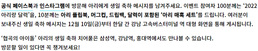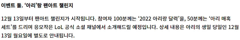 팬아트를 그려 응모하는 식이며 100명에게는 '2022 아리랑 달력'을, 50명에게는 아리 플립북, 머그컵, 드립백, 달력이 포함된 '아리 매혹 세트'를 준다고 합니다. 더불어 팬아트 챌린지 날짜는 12월 13일에 별도로 안내된다고 합니다. 많은 금손들의 참가를 바랍니다.