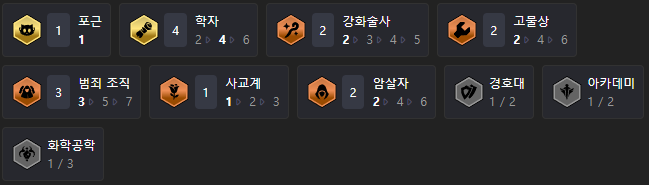 기본적으로 덱을 완성시켰을 때 챙길 수 있는 시너지는 포근(1), 학자(4), 강화술사(2), 고물상(2), 범죄조직(3), 사교계(1), 암살자(2)입니다. 여기에 이제 증강체를 이용해 덱을 강화할 수 있으면 학자(6), 강화술사(3, 4), 암살자(4), 범죄조직(5) 등 시너지를 노려주면 됩니다.
