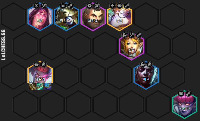 자이라, 리산드라, 에코, 타릭, 브라움, 잔나, 아칼리, 유미로 이루어져 있습니다. 핵심 딜러가 아칼리이며 탱커로서는 브라움을 채용합니다. 더불어 강화술사 타릭, 잔나로 체력을 회복시키며 유지력을 증가시키죠.