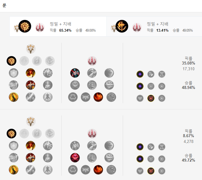 판테온 룬은 집중 공격이 자주 채용되는데요, 그 이유는 패시브 스킬로 강화된 W스킬을 쓰면 그 다음 공격은 3번 공격하여 바로 집중 공격을 터뜨릴 수 있기 때문입니다. 스턴을 먹이고 공격을 3번 하기 때문에 보조룬에 지배 - 비열한 한 방도 굉장히 잘 맞죠. 주 룬은 집중 공격, 승전보, 강인함, 최후의 일격을 들어주는 것을 추천하고 보조룬에는 비열한 한 방, 끈질긴 사냥꾼 룬을 추천드립니다.