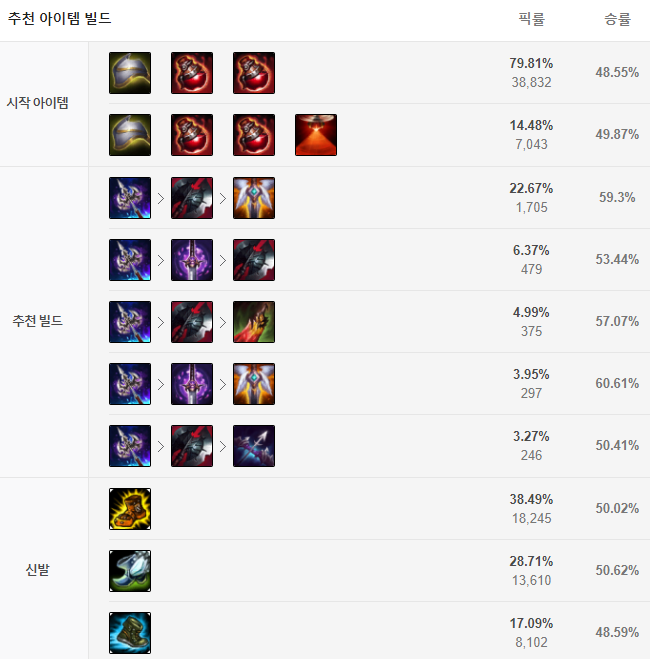 보통 첫 코어템으로 그림자 검을 가서 시야 장악에 힘을 쓰는 모습을 보여주는데요, 그림자 검 이후에는 기동력의 신발을 올려준 뒤 요우무의 유령검 아이템을 추천드립니다. 유령검 아이템의 액티브 스킬을 사용하면 잠시 이동속도가 빨라지는데 이를 통해 상대방에게 빠르게 접근하여 W스킬, 스턴을 안정적으로 넣을 수 있습니다. 그 다음 템으로는 상황을 보고 본인이 좀 많이 죽는다 싶으면 수호천사로 한턴 버티는 것도 좋고, 죽음의 무도 아이템을 올려 탱킹에 신경쓰는 것도 좋습니다. 상대방 팀이 너무 방어력 아이템들을 많이 간 경우에는 블클을 띄워 방어력을 감소시키는 것도 좋은 방법이죠.