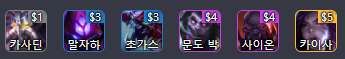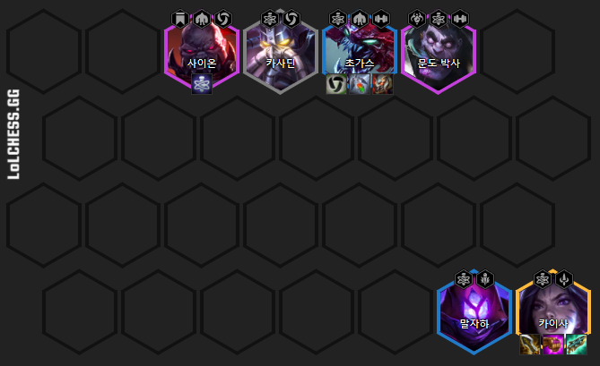 기본 구성은 위와 같으며 만약 돌연변이 상징이 나왔다면 사이온에게 주고 말자하를 뺀 뒤 그 자리에 사교계 유닛을 넣어 카이사의 딜량을 높이는게 좋습니다.