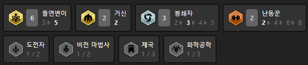 돌연변이 상징을 사이온에게 주지 않더라도 덱을 맞추면 돌연변이(5), 거신(2), 봉쇄자(3), 난동꾼(2) 시너지를 기본적으로 챙길 수 있습니다. 계속 말하지만 핵심은 봉쇄자 상징을 가지고 있는 초가스입니다.
