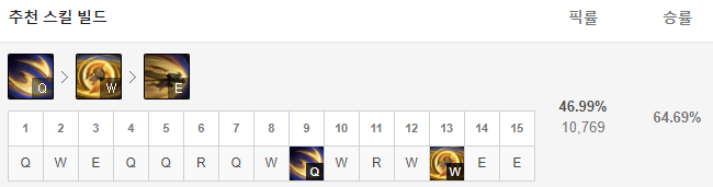 1레벨에 Q스킬와 패시브 스킬을 이용해 원거리 미니언을 정리해주고 근거리도 빠르게 정리해주는게 좋으며, 2레벨에는 W를, 3레벨에는 E를 찍어주신 뒤 그 이후부터는 R-Q-W-E 순서로 스킬을 마스터해주시면 되겠습니다.