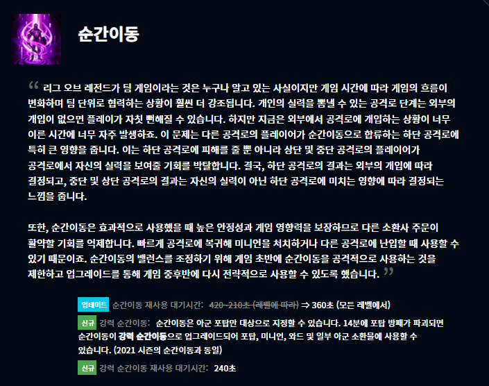 텔레포트가 이제 14분까지는 아군 포탑에만 사용이 가능하도록, 그리고 쿨타임이 전구간 360초로 변경되었습니다. 14분이 지나 포탑 방패가 파괴되고 나면 강력 순간이동으로 변경되어 기존의 순간이동과 마찬가지로 미니언, 와드, 자크 젤리, 자르반 깃발 등에 사용할 수 있으며 재사용 대기시간이 240초로 변경됩니다. 이로서 초반부 다른 라이너들이 텔레포트를 통해 전투에 개입하는게 줄어들게 되었습니다.