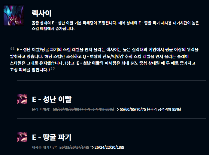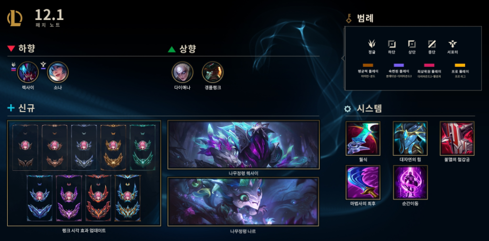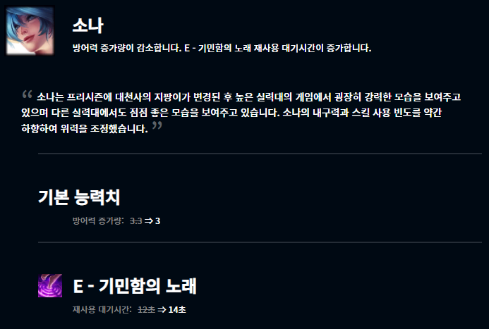 렉사이는 E스킬의 데미지와 쿨타임이 너프되었고 소나의 경우 기본 능력치에서 방어력 증가량이 감소, E스킬의 쿨타임이 늘어났습니다. 저티어에서는 아니지만 높은 실력대의 게임에서 강력한 모습을 보여주었다고 하네요. 저티어에서는 여전히 사용되지 않는데 고티어에서 강하다고 너프를 시키기보단 저티어와 고티어 고루 적절한 능력을 발휘할 수 있게끔 하는게 좋았을거라 생각됩니다.