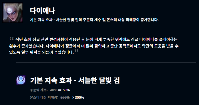 먼저 다이애나의 경우 기본 지속 효과의 주문력 계수가 증가하였고, 몬스터를 대상으로 했을 때 입히는 피해량도 크게 늘었습니다. 다이애나 정글을 자주 볼 수 있을지 기대됩니다. 갱플랭크의 경우는 핵심 스킬인 Q스킬이 착취의 손아귀를 온전하게 사용하지 못하게 된 이후 위력이 감소되어 마나 소모량을 감소하고 쿨타임을 감소시켜서 버프해주었네요.