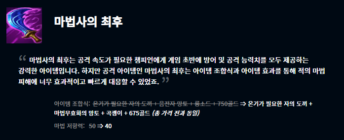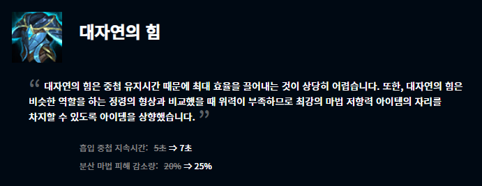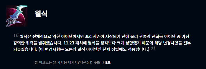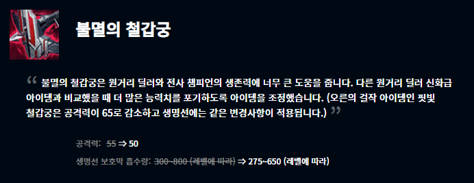 월식은 아이템 효과의 대기시간이 6초에서 8초로 증가했으며, 대자연의 힘은 중첩 유지시간을 5초에서 7초로 늘리고 마법 피해 감소량을 더 늘렸습니다. 불멸의 철갑궁은 원거리 딜러 및 전사 챔피언의 생존력에 너무 지나친 도움을 준다고 생각하여 공격력과 생명선 보호막 흡수량이 둘 다 감소했습니다. 마지막으로 마법사의 최후는 초반 마법사 챔피언들의 피해를 너무 효과적이고 빠르게 대응할 수 있다는 이유로 하위 아이템들을 변경해주고 마법 저항력이 감소했습니다.