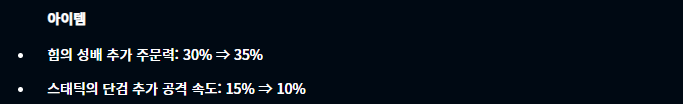 수호 천사, 모렐로노미콘, 스태틱의 단검 너프, 태양불꽃 망토 조정, 즈롯 차원문, 힘의 성배, 고속 연사포 버프입니다. 너무 자주 사용되는 아이템은 너프했고 반면 잘 사용되지 않는 아이템은 버프했다는 느낌이네요.