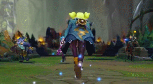 제리가 짧은 거리를 돌진합니다. 돌진 중 지형에 닿으면 뛰어넘어 돌진 거리를 크게 늘립니다. 또한 스킬 사용 후 다음 집중 사격 3회가 적을 관통하며, 첫 대상 이외에 적에게 감소된 피해를 입힙니다. 기본 공격이나 스킬로 챔피언을 적중하면 해당 스킬의 재사용 대기시간이 1.5초 감소합니다. 루시안의 E스킬의 업그레이드 버전이라고 생각됩니다.