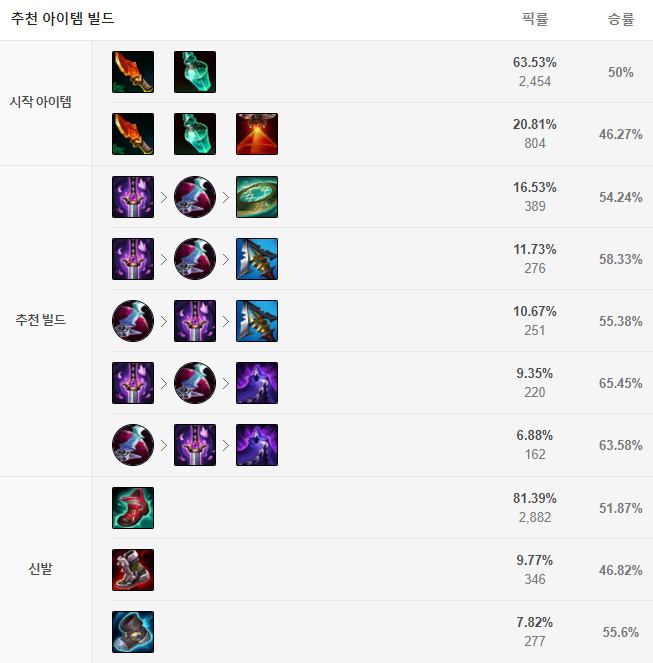 보통 요우무, 월식, 원칙의 원형낫 빌드를 많이 사용합니다. 신발의 경우 스킬 가속을 올려주는 아이오니아 장화가 일반적이며 이후에는 밤의 끝자락, 세릴다의 원한 독사의 송곳니 등의 아이템을 고려해볼 수 있습니다.