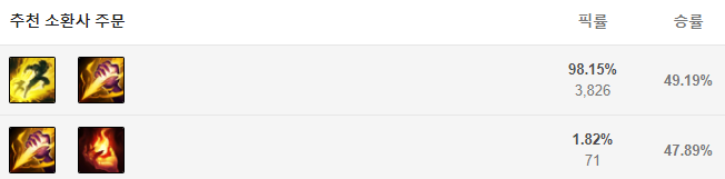 정글러 답게 점멸과 강타를 들어줍니다. 점화를 들어주는 경우도 보이지만 극히 일부분이기에 점멸, 강타를 들어주면 되겠습니다.