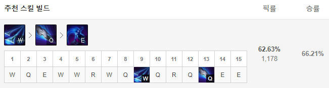 1레벨에는 W스킬, 2레벨에는 Q스킬, 3레벨에는 E스킬을 찍어준 뒤 4레벨부터는 R-W-Q-E 순서로 스킬을 마스터해주시면 됩니다.