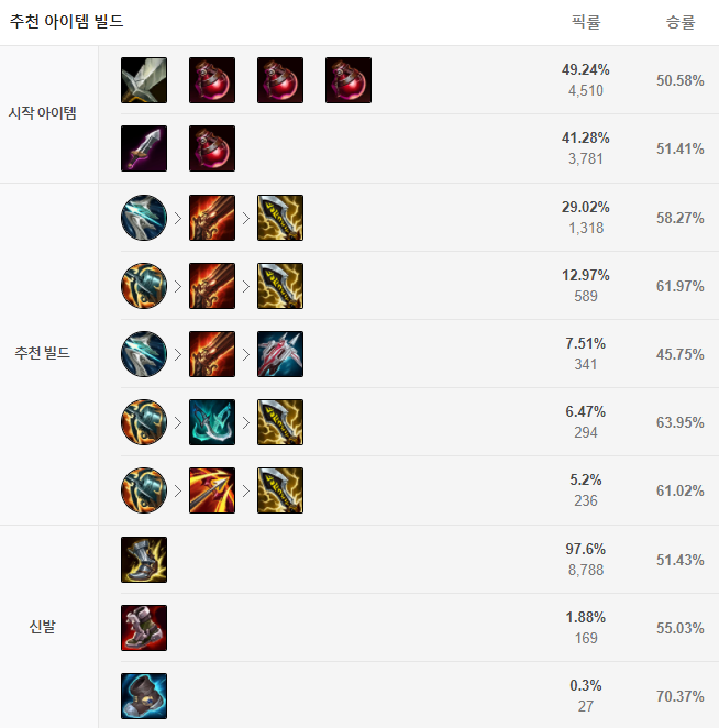 도란검이나 롱소드로 스타트를 해주시고 이후 돌풍을 첫 코어 아이템으로 많이 올려줍니다. 이후 고속 연사포와 무한의 대검을 차례로 뽑는게 가장 인기있는 템트리입니다. 그 이후부터는 상황에 맞게 도미닉 경의 인사, 피바라기, 루난의 허리케인, 수호 천사 등을 올려주시면 됩니다. 신발은 첫 번째 코어 아이템을 띄워준 이후 광전사의 신발을 올려주면 됩니다.
