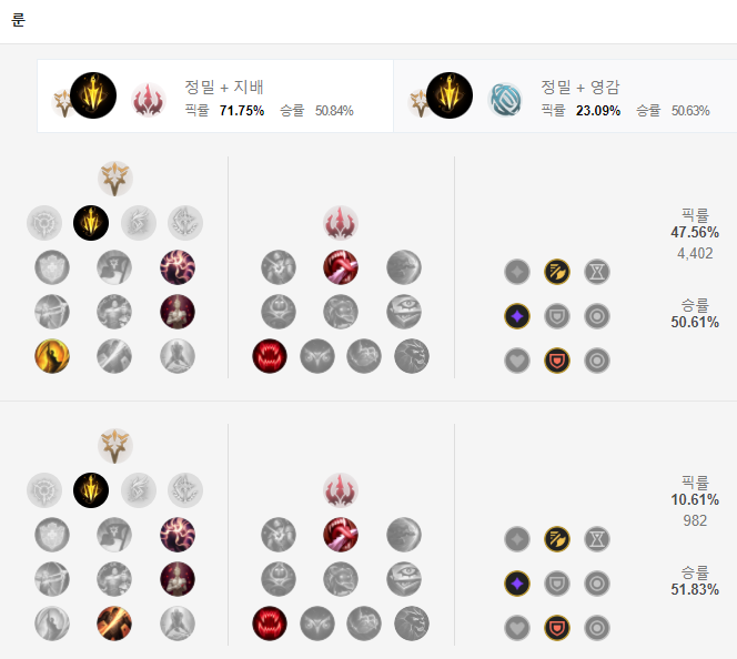 룬은 정밀에서 치명적 속도, 침착, 전설: 핏빛 길, 최후의 일격을, 보조룬은 지배에서 피의 맛과, 굶주린 사냥꾼을, 룬 파편은 공격 속도, 적응형 능력치, 방어력을 들어주면 되겠습니다.