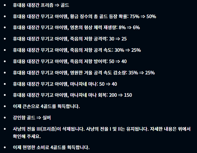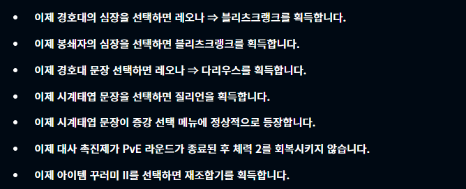 증강체 부분에서 선택시 골드를 추가로 획득하는 경우가 많아졌고, 또 문장 선택시 획득하는 챔피언들이 변경되었습니다. 또한 대사 촉진제의 경우 이제부터 몬스터들이 등장하는 스테이지가 끝나고 나서는 체력이 회복되지 않고 오직 플레이어와의 전투 후에만 체력이 2 회복됩니다. 또 저격수의 은신처 증강 선택시 저격수 유닛에 증강체 효과가 얼마나 중첩되었는지도 확인이 가능해지고, 그 외 여러 변경점들이 있네요.
