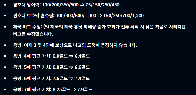 반면 특성 부분은 경호대가 크게 버프되었으며 용병의 경우 너프, 사교계(3)은 버프, 범죄 조직은 전체적으로는 너프되었으나 7시너지를 맞췄을 경우에는 버프가 되었습니다. 고물상도 4시너지에서 깨알 버프가 되었네요.