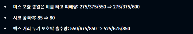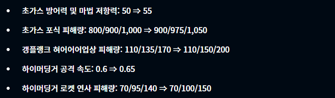 초가스의 경우 1성, 2성일때 그렇게 좋은 효과를 발휘하지 못한다고 생각하여 초가스를 버프해주었습니다. 또한 하이머딩거는 지난번에 버프를 받았음에도 그렇게 크게 활약하지 못하고 있는 모습을 보여주어 이번에 한번 더 버프를 해준 모습입니다. 그 외에도 여러 챔피언들의 능력치가 조정되었습니다. 특히 탐켄치는 초반에 일찍 나오면 후반에 굉장히 게임을 쉽게 풀어나가는 모습을 보여줬는데 그런 이유인지 탐켄치를 너프했습니다.