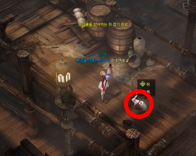 퀘스트 구역으로 이동하게 되면 저렇게 조그만한 쥐들이 움직이는 것을 볼 수 있습니다. 마우스 커서를 정확하게 가져다 대고 우클릭하여 쥐를 잡아줍니다.