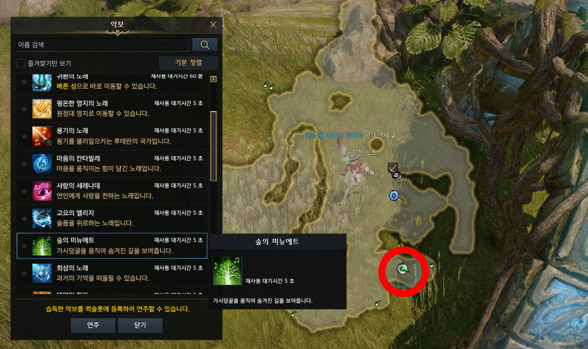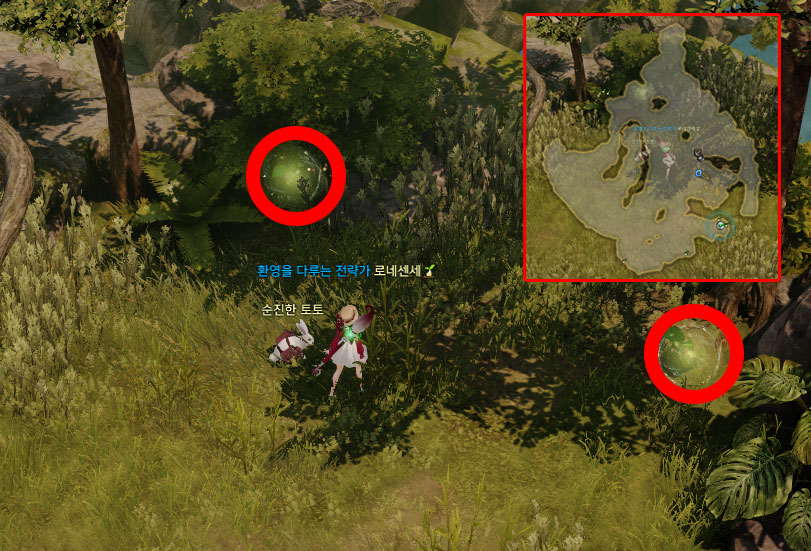 덩굴로 막혀져 있는 부분에서 숲의 미뉴에트를 사용하면 덩굴이 풀리며 길이 열립니다. 그대로 안쪽으로 들어가시면 1번, 2번 모코코를 찾을 수 있습니다.