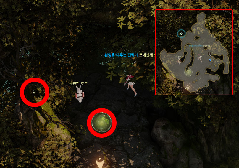 덩굴로 막혀져 있는 부분에서 숲의 미뉴에트를 사용하면 덩굴이 풀리며 길이 열립니다. 그대로 안쪽으로 들어가시면 1번, 2번 모코코를 찾을 수 있습니다.