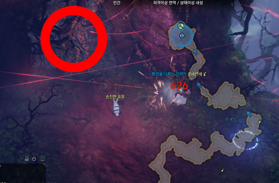 탄식의 정원 보스 스텔라는 체력이 일정 이하로 떨어지면 삐에로 몬스터들을 여러 마리 소환하는 패턴이 있습니다. 이 삐에로들은 플레이어를 향해 달려오며 일정 거리 이하로 근접했을 때 자폭을 합니다. 이 삐에로들을 위의 바위 부분으로 유인하여 바위 근처에서 터뜨리게 함으로 세 번째 모코코 씨앗이 있는 곳으로 들어갈 수 있습니다. 바위를 부수기 위해서는 총 4마리의 삐에로가 바위 주변에서 자폭을 해야하며, 이 패턴은 딱 한 번 사용하기 때문에 실패하는 경우 재도전이 필요합니다.