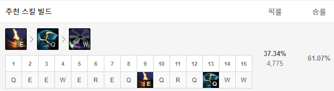 1레벨에는 Q스킬, 2, 3레벨에는 E스킬, 4레벨에는 W스킬을 찍어주고, 5레벨 부터는 R-E-Q-W 순서로 스킬을 마스터해주시면 됩니다.