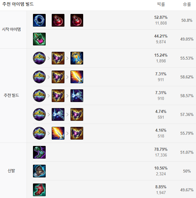 빅토르는 이따 나올 룬 부분에서 시간 왜곡 물약을 들어주지 않기 때문에 보통 부패 물약보다 도란링에 포션 두 개를 가는 경우가 더 많습니다. 첫 번째 코어 아이템으로는 부서진 여왕의 왕관을 올려주고 마법사의 신발을 띄워준 뒤 이후 두 번째 코어 아이템으로는 그림자불꽃을 고정적으로 올려줍니다. 그 다음부터는 상황을 보고 존야의 모래시계, 리치 베인, 우주의 추진력 등을 고려할 수 있습니다.
