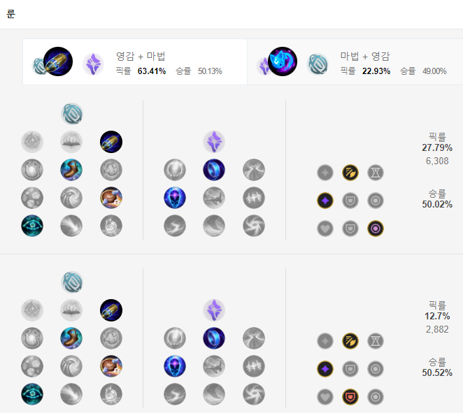 메인 룬으로는 영감의 선제 공격을 들어줍니다. 하위 룬으로는 마법의 신발, 비스킷 배달, 우주적 통찰력을 들어주고 보조룬으로는 마법에서 마나순환 팔찌, 깨달음을 들어줍니다. 룬 파편에는 원활한 CS 파밍을 위한 공격 속도와 딜링을 더 증가시키는 적응형 능력치, 그리고 마지막은 상대가 AP면 마법 저항력, AD면 방어력을 들어주면 되겠습니다.