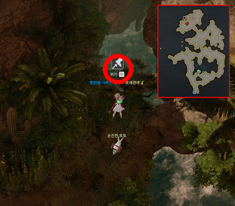 해당 미니맵 위치로 가면 뛰기(G) 키가 활성화됩니다. 그렇게 뛰기를 눌러 이동하다 보면 모코코를 발견할 수 있습니다.