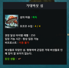 로스트아크 섬들 중 하나인 거대버섯 섬은 상시 입장 가능한 섬 중 하나로 섬의 마음이 존재하며 모코코 씨앗은 총 4개가 존재합니다. 공명의 노래, 숲의 미뉴에트 등 특수 조건이 필요하지 않기 때문에 쉽게 모코코 씨앗을 모을 수 있으며 섬의 마음 역시 시간만 조금 들인다면 쉽게 얻을 수 있습니다.