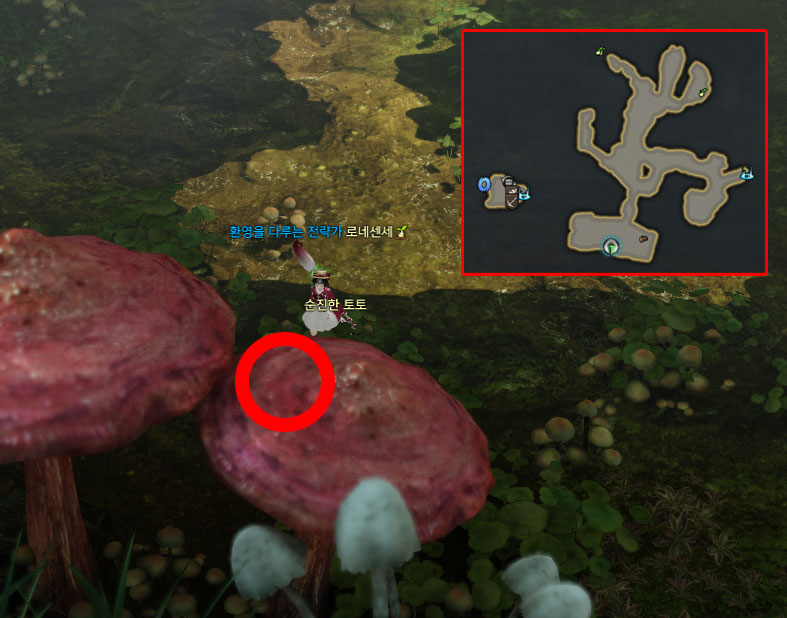 버섯 안쪽에 있어서 육안으로 확인이 불가능합니다. 따라서 해당 위치로 가서 상호작용(G) 키가 활성화되는 것으로 모코코를 캐주시면 됩니다.