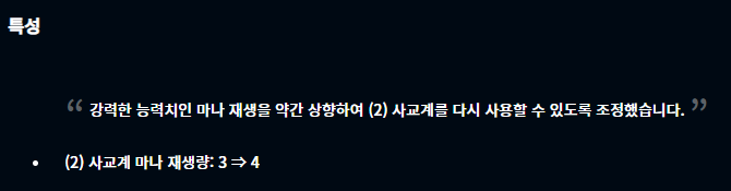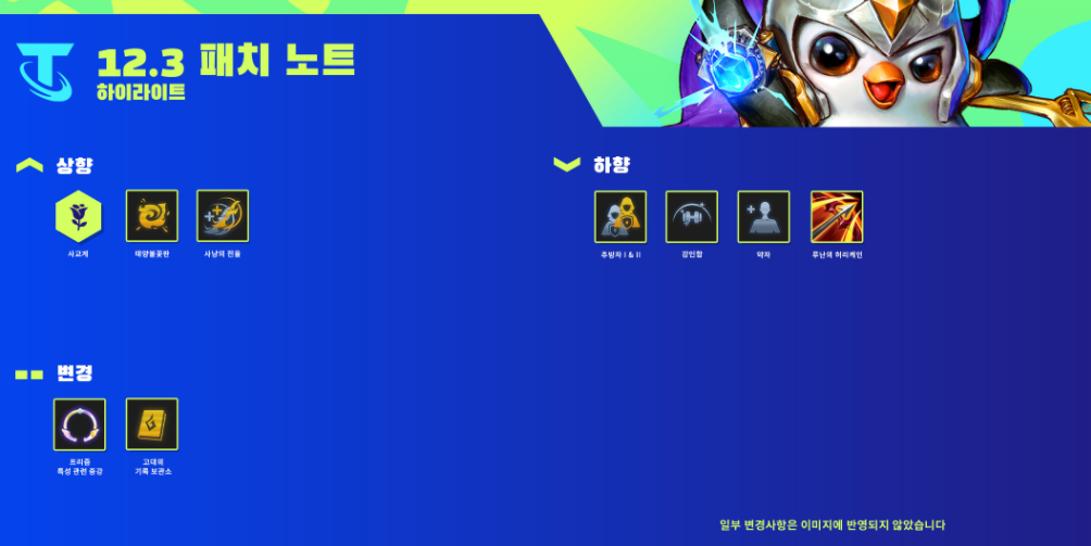 진짜 이번 패치는 쉬어가는 듯한 느낌이 눈에 딱 보이네요. 너무 텅텅 비었습니다. 그나마 특성은 사교계가 상향되었고, 증강체는 태양불꽃판, 사냥의 전율이 상향, 추방자, 강인함, 약자가 너프되었으며 아이템은 루난의 허리케인이 너프되었습니다. 또한 프리즘 특성 관련 증강과 고대의 기록 보관소가 변경점이 있네요.